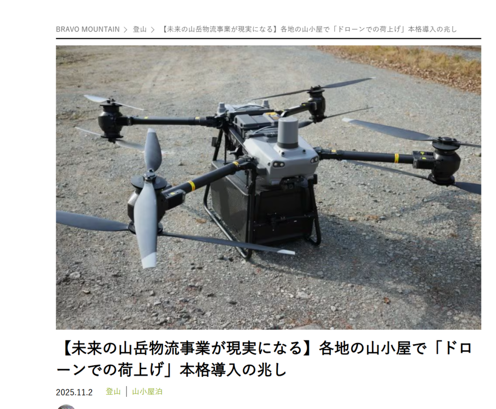 アウトドアメディア「BRAVO MOUNTAIN」で、「【未来の山岳物流事業が現実になる】各地の山小屋で「ドローンでの荷上げ」本格導入の兆し」というタイトルの記事で、弊社が紹介されました。 https://bravo-m.futabanet.jp/articles/-/126821